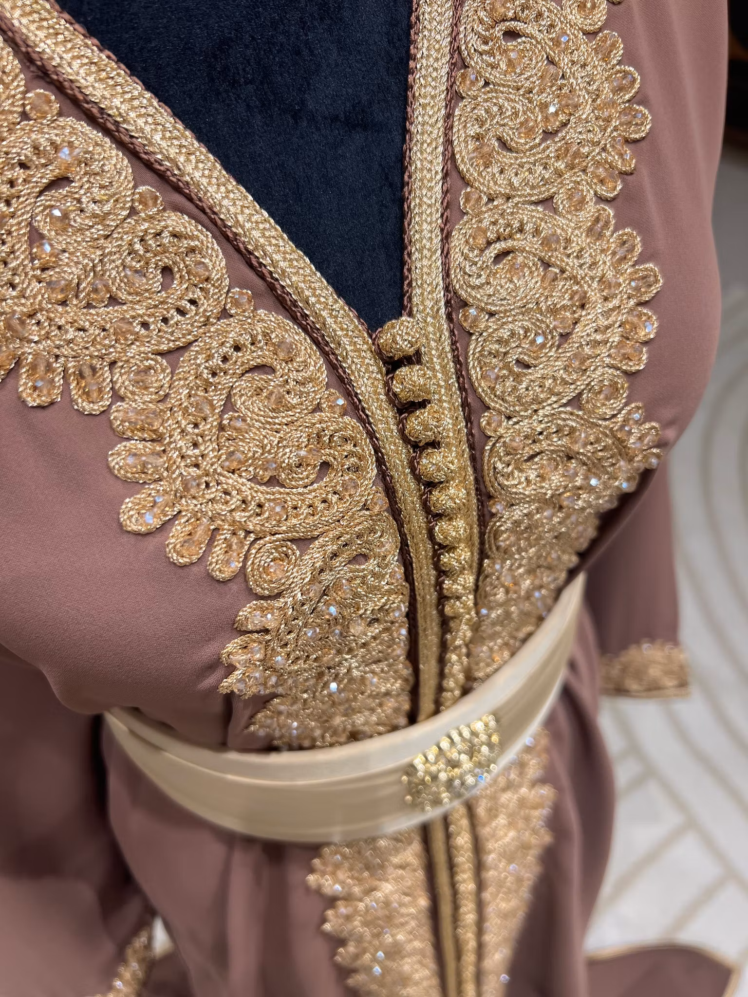Vita kaftanen kan behöva en kortärmad underklänning då enbart ärmarna är fodrade.