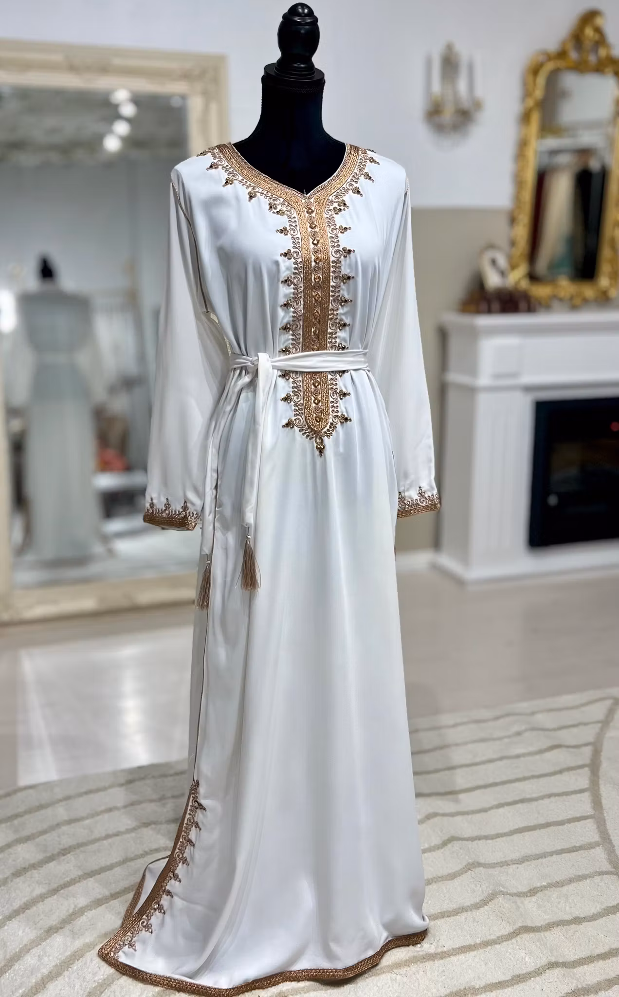 Qandora Ines Vit 350 kr Se beskrivningen nedan. Storlek: S-M. I lager Lägg i korgen Dela Beskrivning Oanvänd och Ny. Kaftanen har inte tvättats efter produktion/transport och kan ha mindre fläckar som går bort vid tvätt.Skärp: IngårStorlek: S-MByst: 104 cmLängd 145 cm